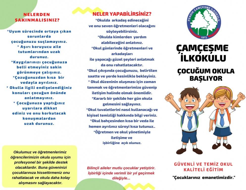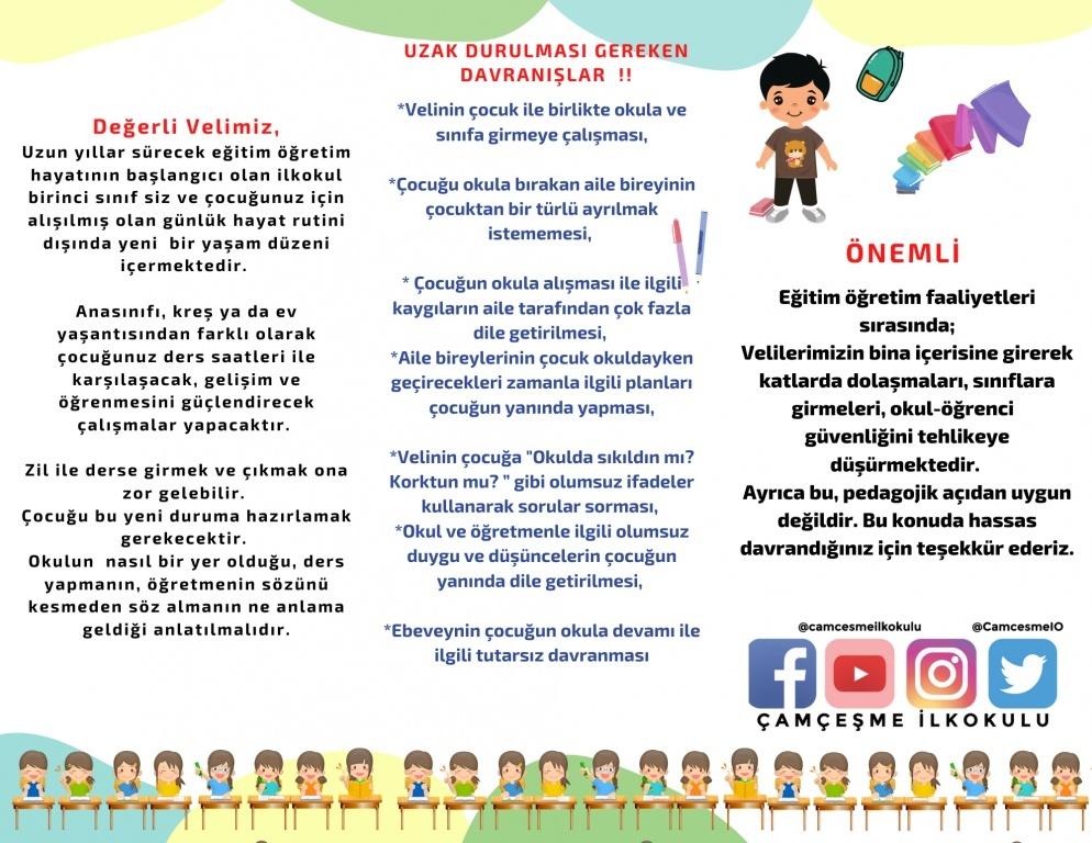 Değerli velilerimiz okulumuz tarafından hazırlanan "Çocuğum Okula Başlıyor" veli broşürümüzü dikkatle okumanızı önerir size aktarılanlar konusunda göstereceğiniz hassasiyet için şimdiden teşekkür ederiz.